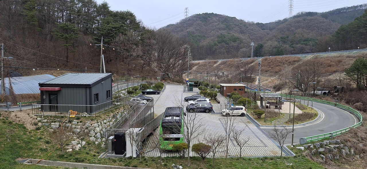 입암저수지 둘레길 산책중 제방길에서 버스정류장과 공용주차장 한컷!!! ▼