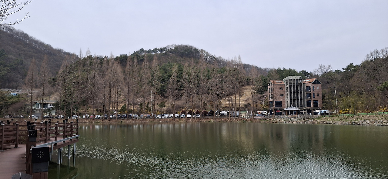 입암저수지 둘레길 산책중 테크로드에서 한마음정육식당 계룡입암점과 메타쇄콰이어 한컷!!! ▼
